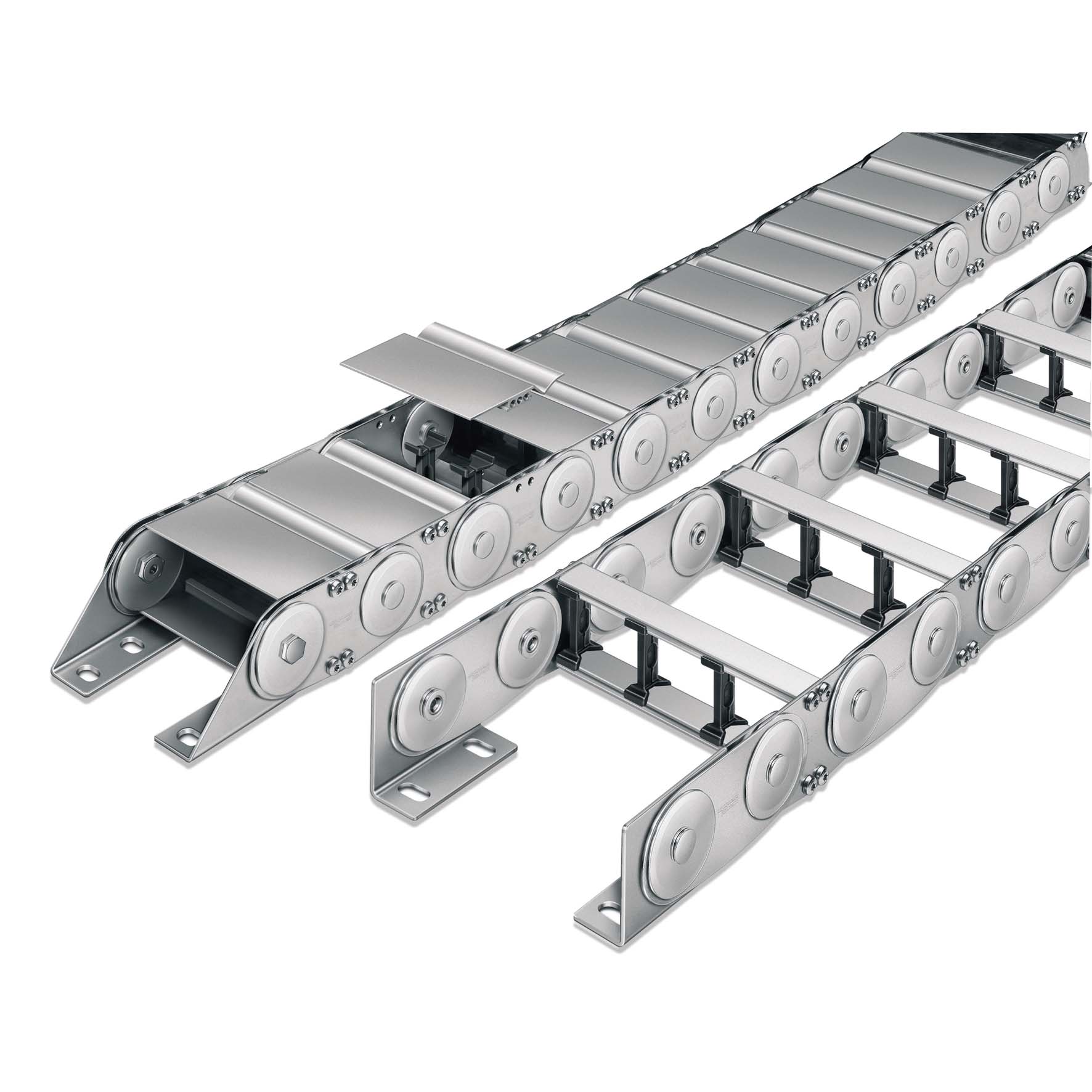 Opening and removable cover frames - Completely enclosed design to protect chain content from steel and wood chips, dust, etc.