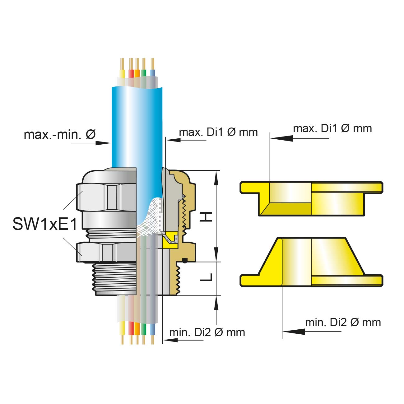 - When the pressure screw is tightened, the sealing insert presses the inner and outer cones together, thus also compressing the cable shield located between them. A low-resistance and low-impedance 360° connection is made between the shield, the earthing insert and the gland body over a large area (see assembly instructions). The braiding ends in the gland.