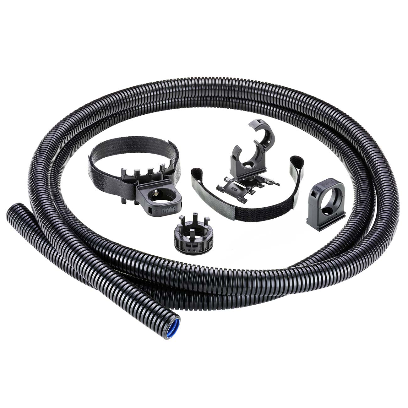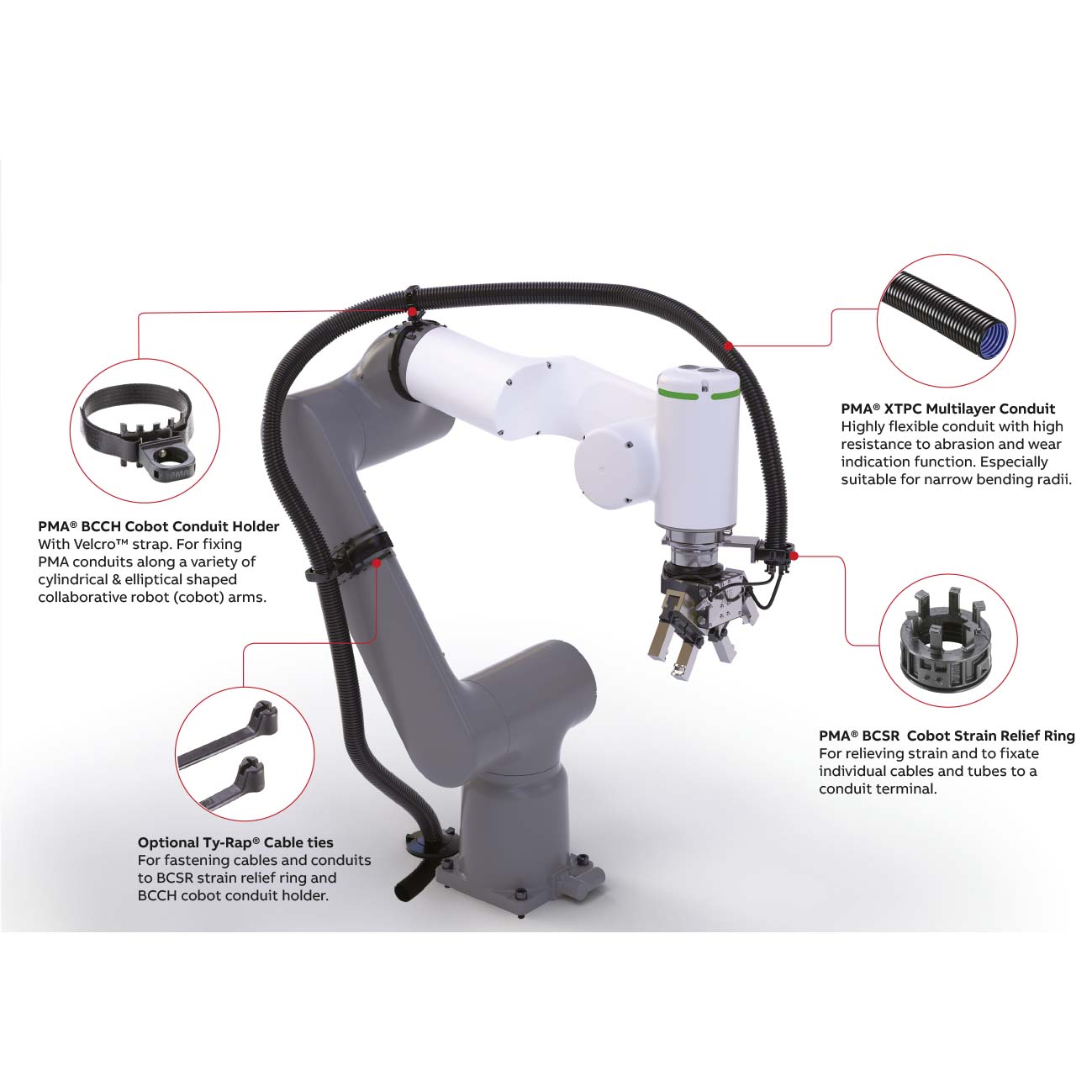 The PMA Cobot Cable Protection Kit offers an easy-to-use dress pack solution for collaborative robots, allowing to fasten, rout and protect cables & tubes. The KIT includes PMA Cobot Conduit Holders, a PMA Cobot Strain Relief (additionally with a BFH-0 for mounting) and a 3/4m sample of the XTPC multilayer conduit, featuring a wear indication function.