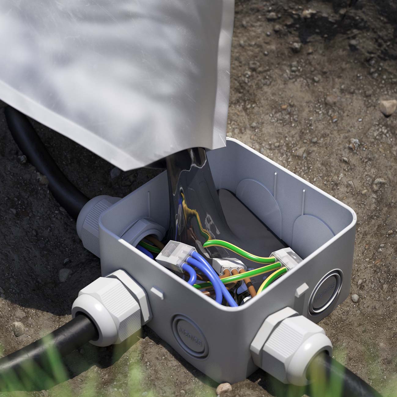 • Includes 3 cable glands and lock nuts M25, clamping range ø11 - 17mm, suitable for the common in-ground cables XmVKas and YmvKas.