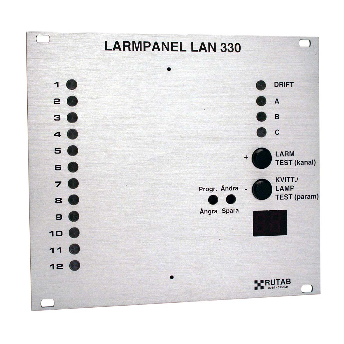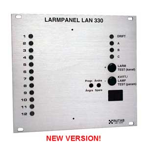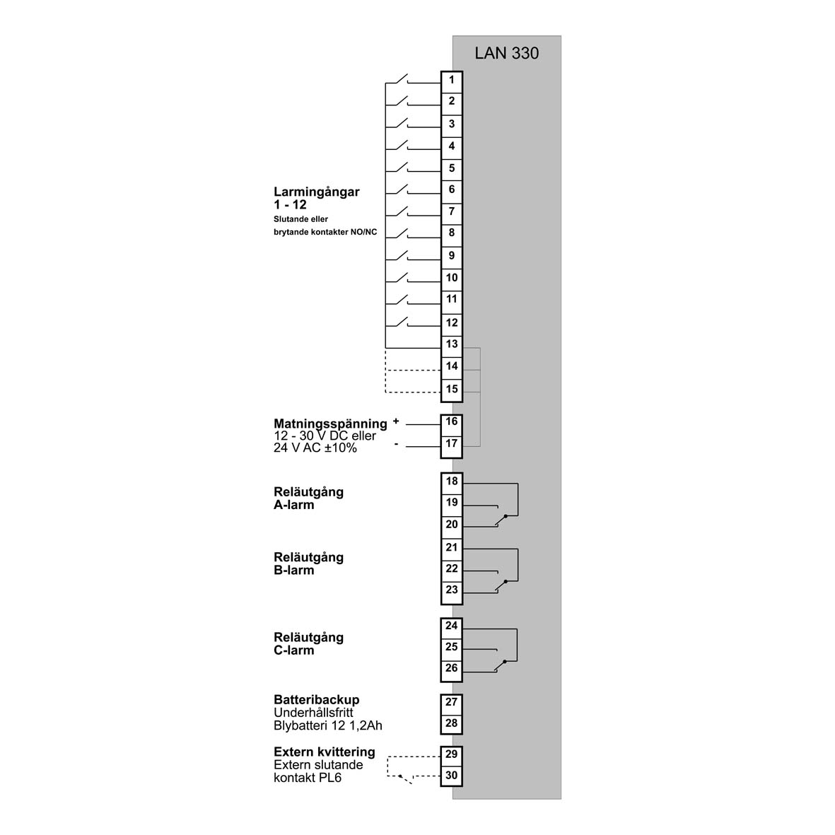 LAN 330 med programmerbart larmminne, larmföljdsvisning och extern kvittering. Summalarm A, B, C och summer. Förberedd för batteribackup. • 12 larmingångar. • Alla inkommande kablar ansluts till plug-in-bara skruvplintar som förenklar montaget. • 3st potentialfria växlande summalarmsutgångar, prioritet A, B eller C. • Panelen är avsedd att monteras på apparatskåp, 19” subrack 3HEx28TE eller vår kapsling KL50. • Slutande eller brytande larmgivare. Positiv ingångsspänning (+24V) eller 0V vid larm. • Indikering med lysdioder på modulens front. • Varje larmingång är individuellt programmerbar: • Digital inställning av fördröjningstider på in och utgångar, 1sek… 9h. • För slutande eller brytande larmkontakter(NO/NC). • Valbara som larm (röd diod) eller driftindikering (gul diod). • Programmerbart larmminne, larmföljdsbevakning. • Visning av larmföljd. • Programmerbart akustiskt larm. • Avbrottsfri drift kan erhållas med ett yttre blybatteri (T.ex. LAN BAT 12). • Sex slavar (LAN 330 programmerad som slav) kan kopplas till mastern via en bandkabel (beställs separat) och ger då 84 ingångar. • Panelens front är försedd med återställning, lysdiodtest samt larmtest. • Summalarmsutgångarna larmar vid spänningsbortfall. • Panelen kan förses med parallellkort LAN 300PR/330, vilket ger 12 galvaniskt fria kontakter för parallell överföring av larm.